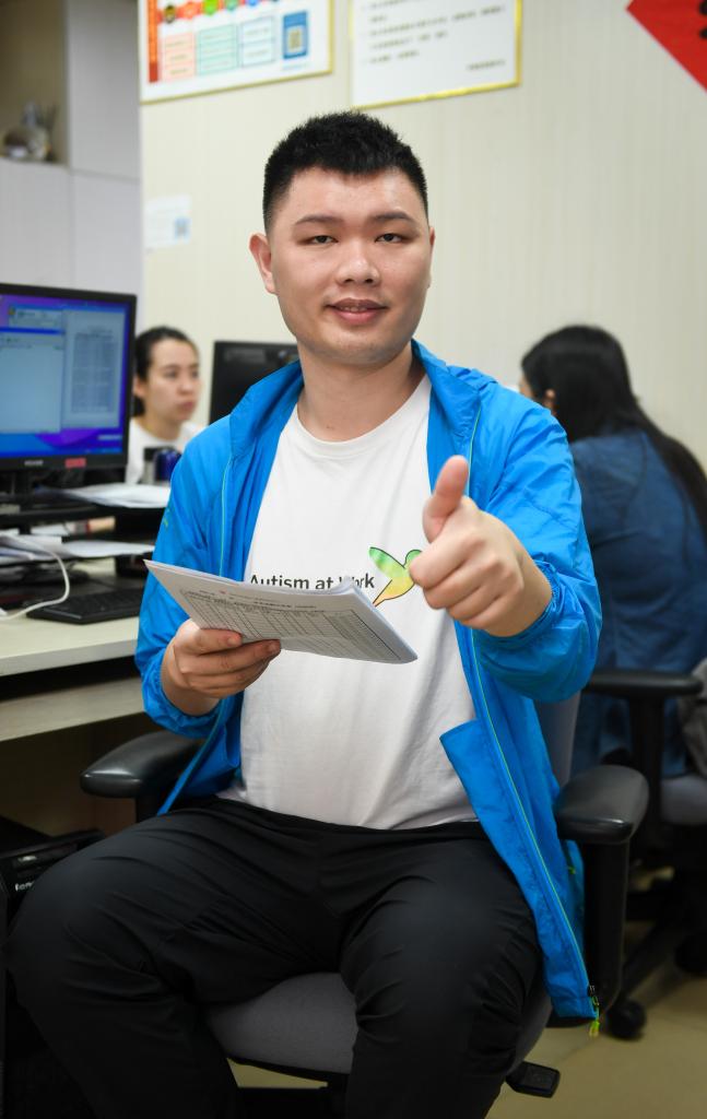 这是3月27日在深圳市自闭症研究会拍摄的“心青年”戴劲宇。29岁的戴劲宇2018年10月入职深圳市自闭症研究会,担任办公室职员,目前他主要负责扫描复印资料和室内消毒工作。