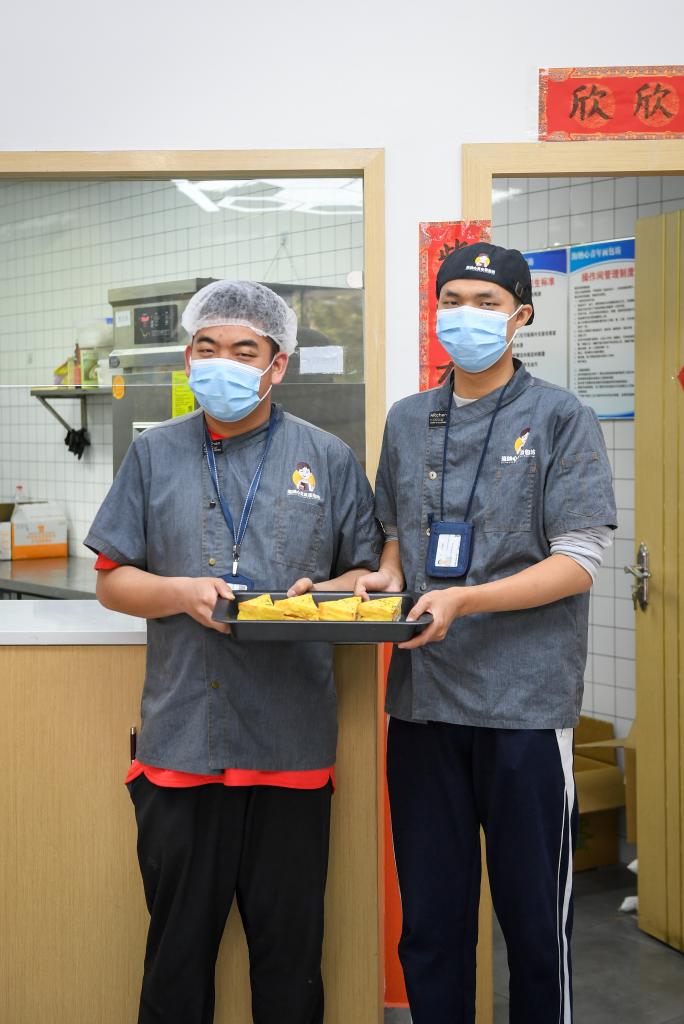 3月21日,在深圳海纳心青年烘焙空间,“心青年”刘瀚阳(右)和彭旌锐制作糕点。25岁的刘瀚阳和23岁的彭旌锐2023年6月起在深圳海纳心青年烘焙空间担任面包师。除了跟老师一起制作面包和点心外,他们还可以承担收银和送外卖等工作。