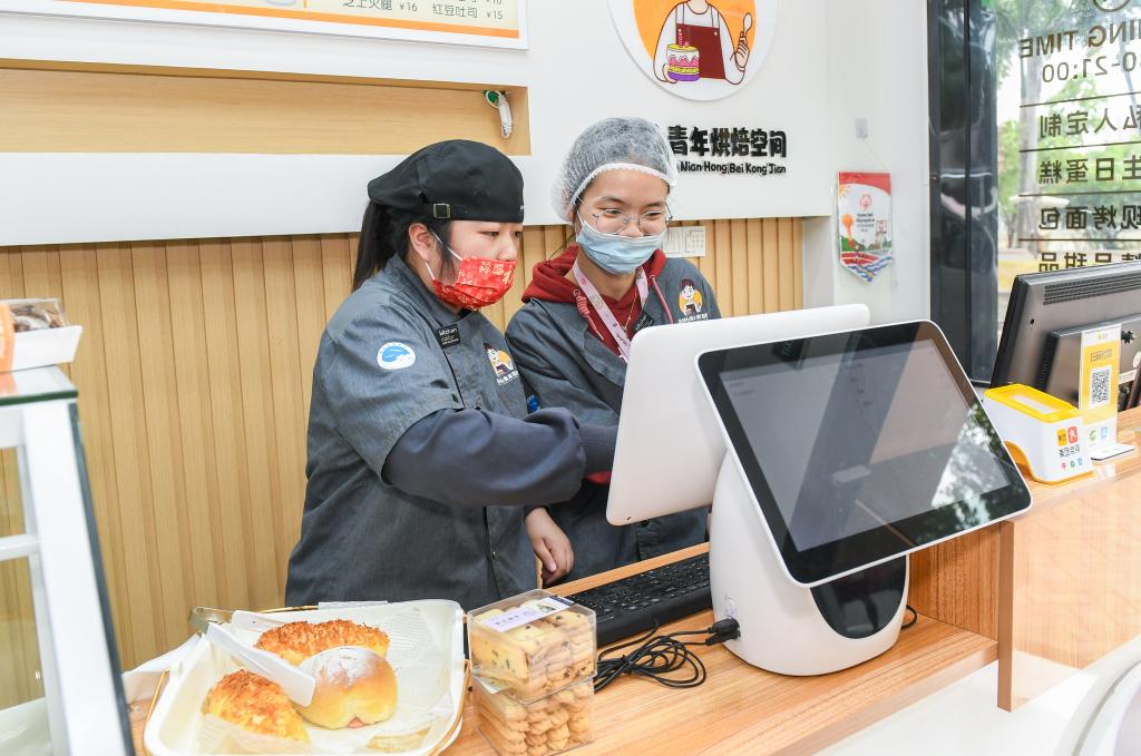这是3月21日在深圳海纳心青年烘焙空间拍摄的“心青年”袁安琪(右)和邱敏怡。22岁的袁安琪和28岁的邱敏怡2023年6月起在海纳心青年烘焙空间担任收银员,两人搭档给客人结账和打包,也会跟老师一起制作面包和糕点,虽然动作有点慢,但在大家的理解和支持下不断进步。