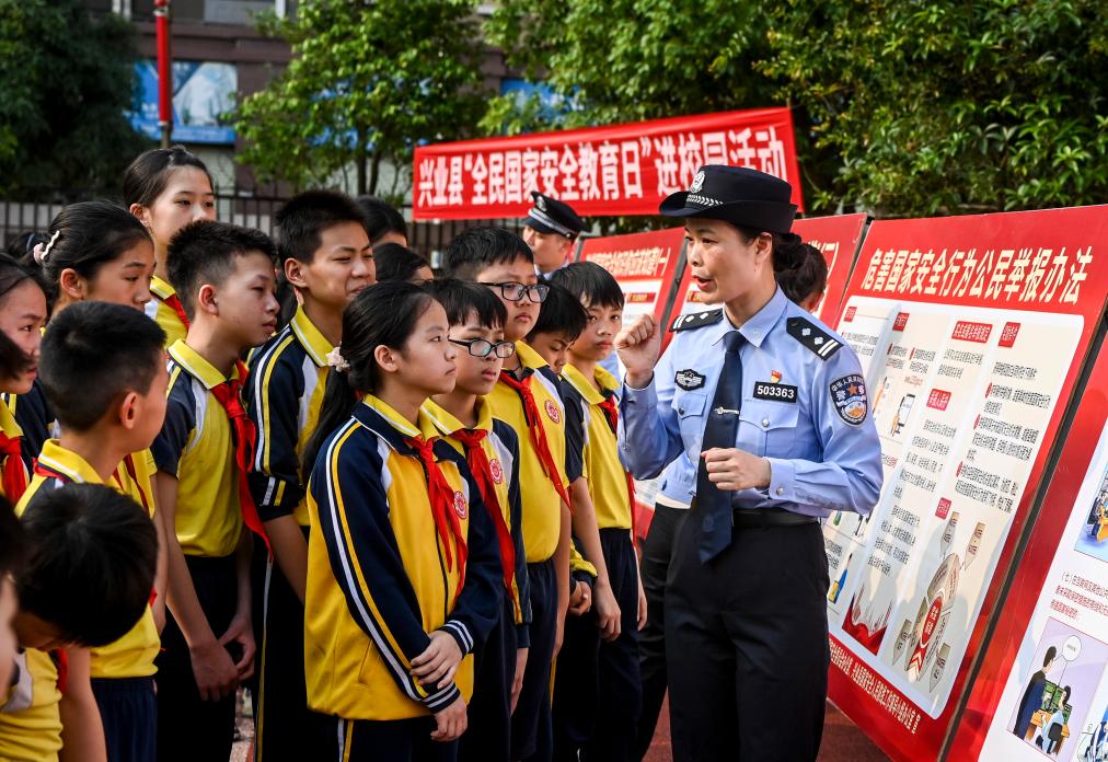 4月15日,在广西兴业县一所小学内,公安民警在讲解国家安全相关知识的过程中与学生们互动。