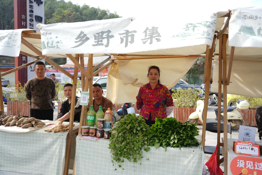 在景区大门口“那乡游礼”的土货集市上,附近村民售卖自家产的特色农产品,生态土猪肉、鸭嘴鱼、土鸡和鸡蛋、沃柑、蘑菇、野菜等充满“乡味”的农产品颇受欢迎。