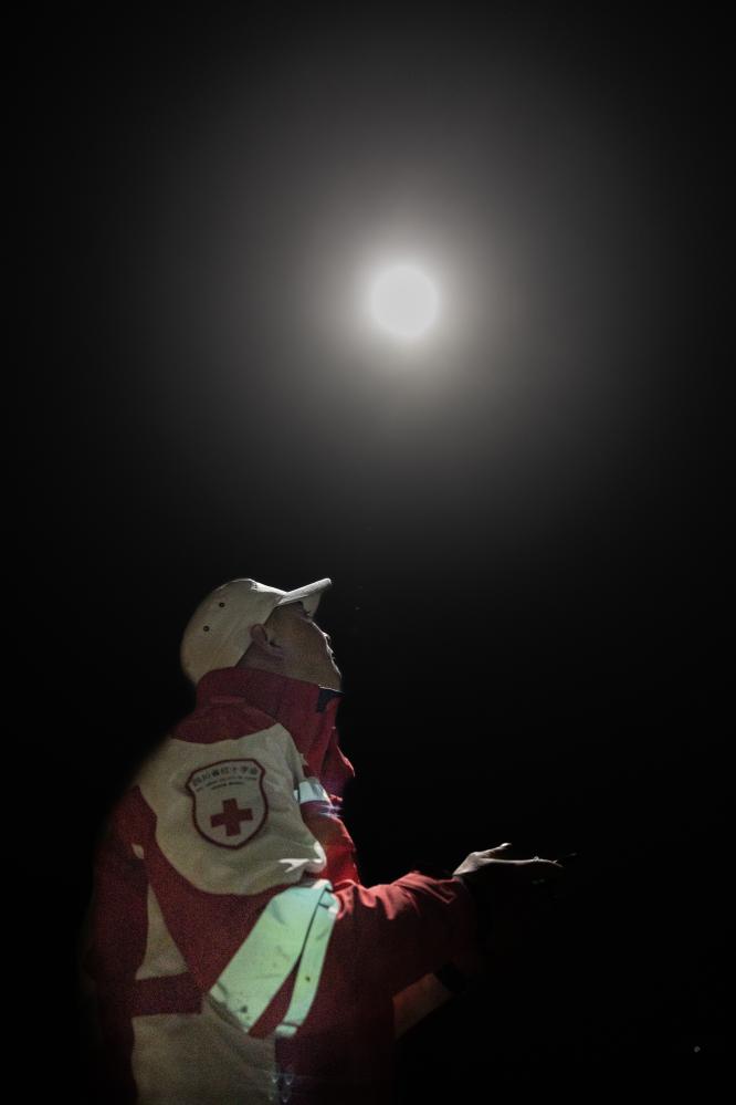2月9日晚,在搜救现场,四川省红十字应急救援救护中心的宋尧操控无人机进行空中照明。
