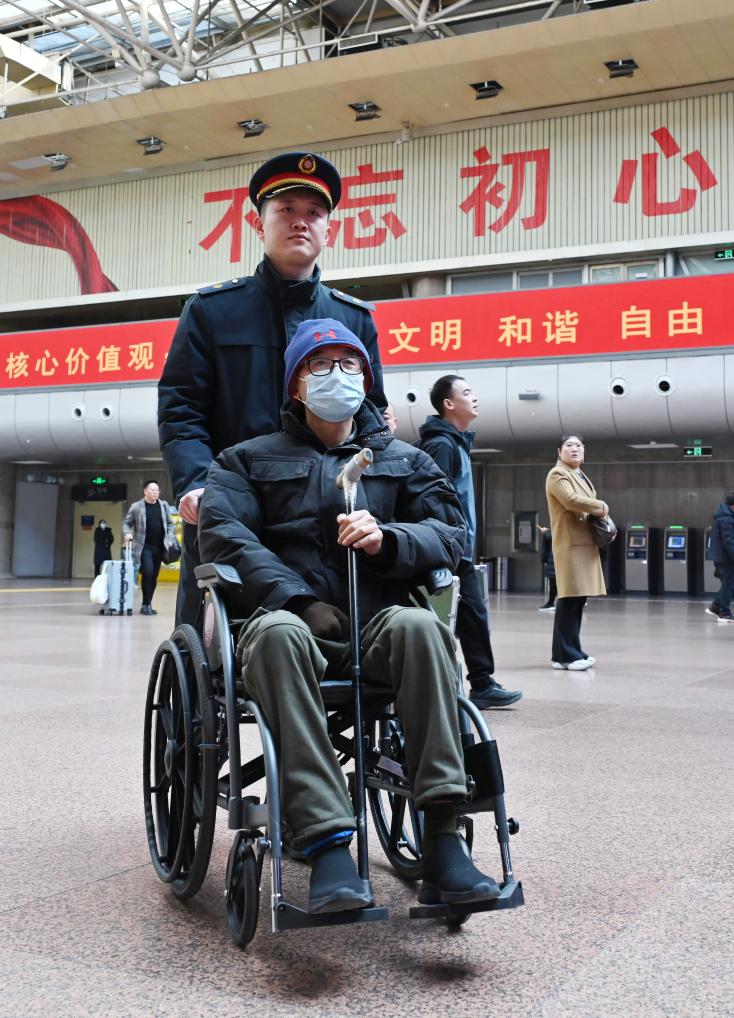 2月18日,北京西站“036候车室”客运员杨晋宇将行动不便的旅客推至候车室。