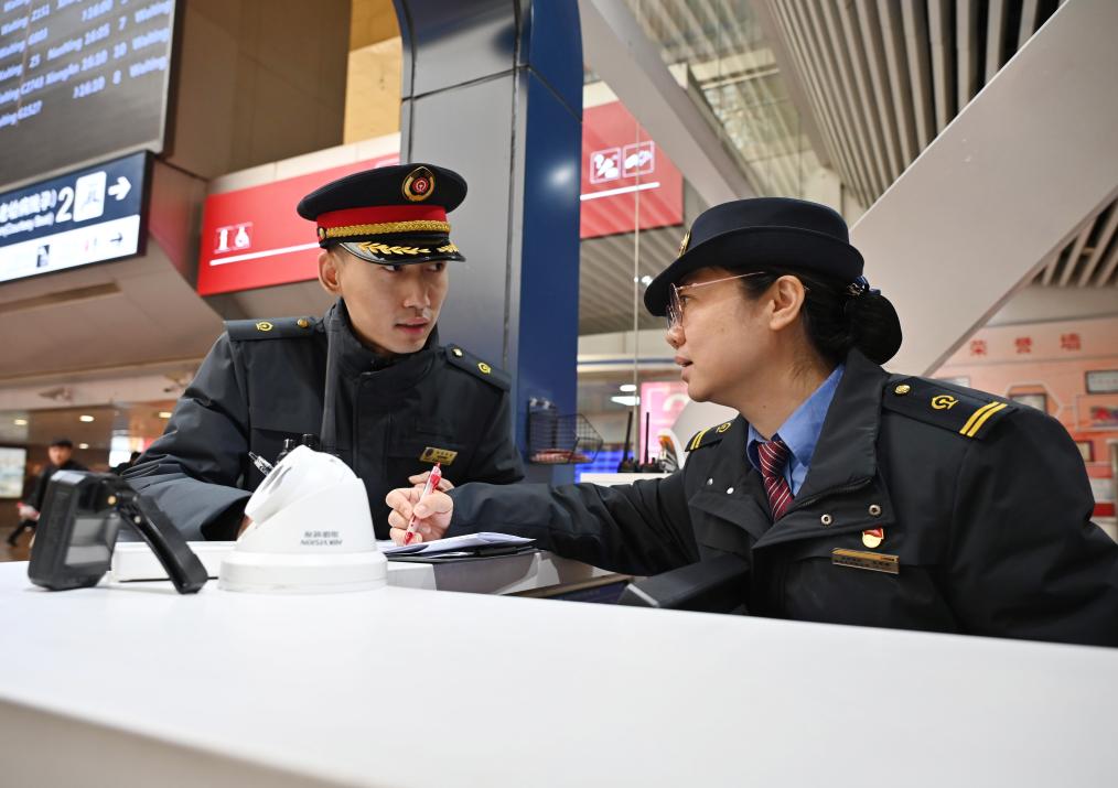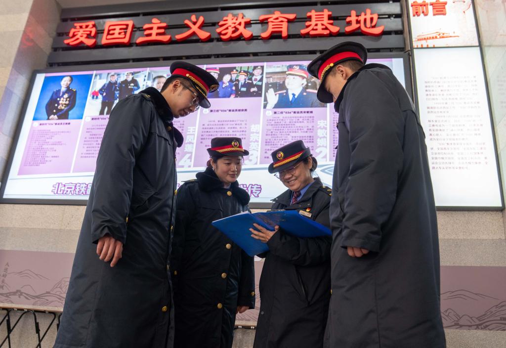 2月18日,北京西站“036候车室”客运员杨晋宇(左)在查验旅客证件。