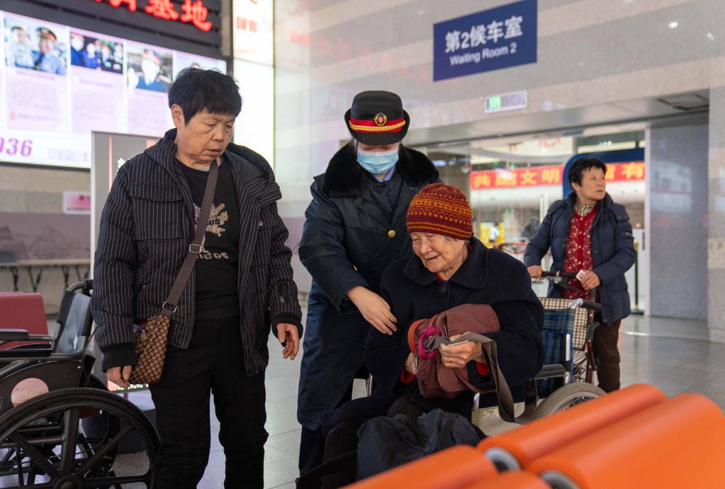 2月18日,在北京西站“036候车室”,客运员冯雪(左二)搀扶行动不便的旅客落座。