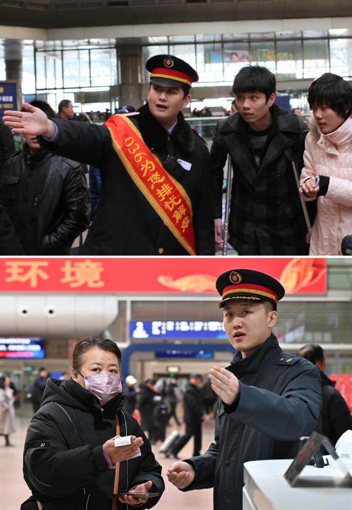 拼版照片:上图为北京西站“036候车室”客运员高雨宸为旅客提供引导服务(资料照片,新华社发);下图为北京西站“036候车室”客运员杨晋宇为旅客提供引导服务(新华社记者任鹏飞2月18日摄)。