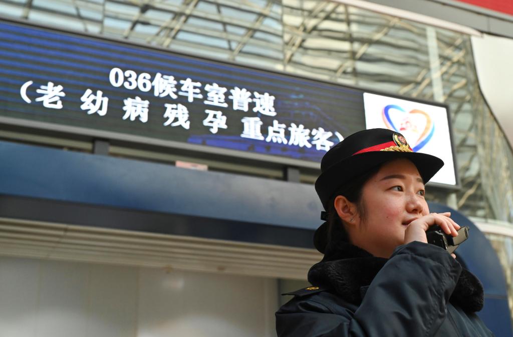 2月18日,北京西站“036候车室”客运员冯雪通过对讲机和同事沟通工作。