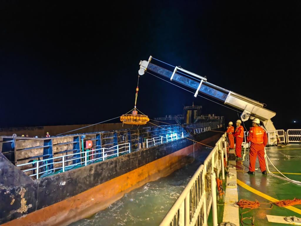 “南海救102”轮通过救生吊篮将12名遇险船员安全转运。(交通运输部南海救助局供图)