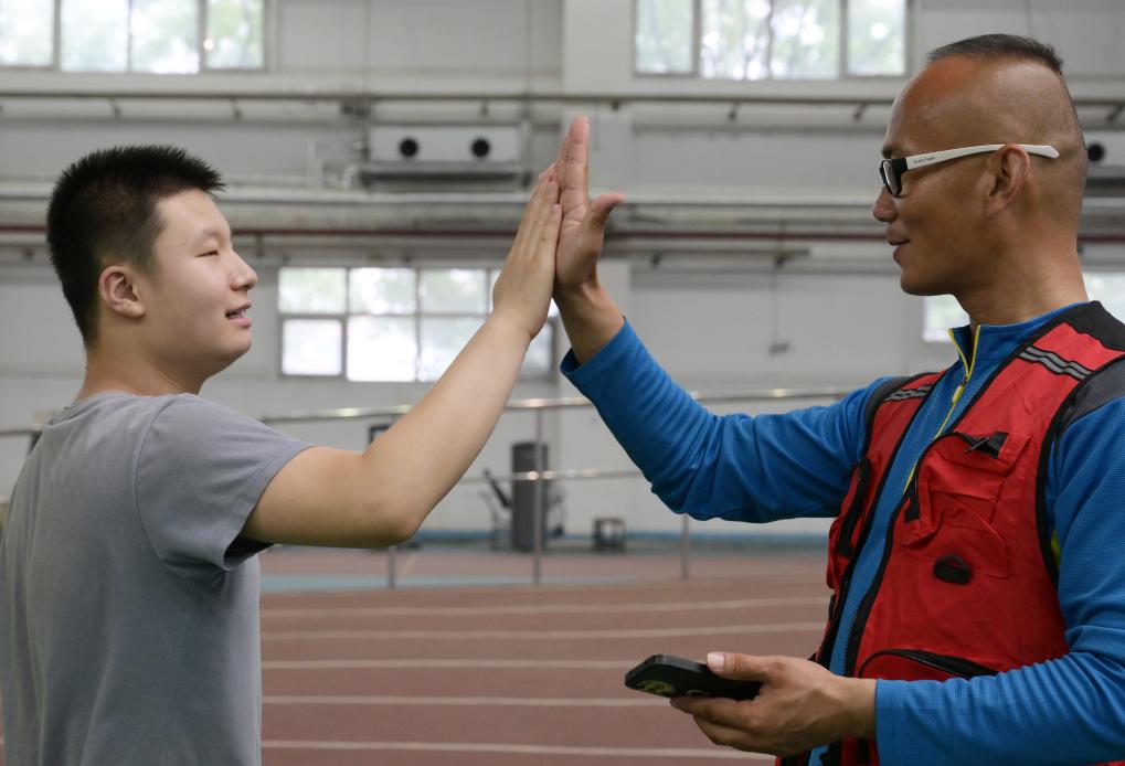 8月10日,一位参加现场活动的残疾人同活动项目安全教练员击掌。