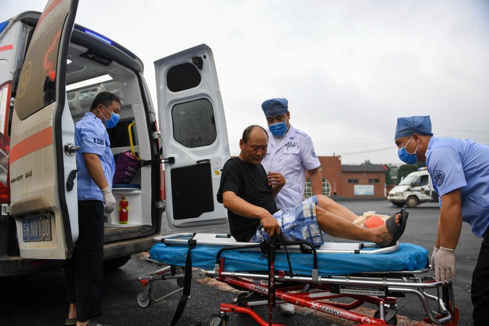 2023年8月1日,在北京市门头沟区妙峰山镇妙峰山民族学校临时安置点,北京急救中心工作人员在转运一名受伤村民。新华社记者鞠焕宗 摄