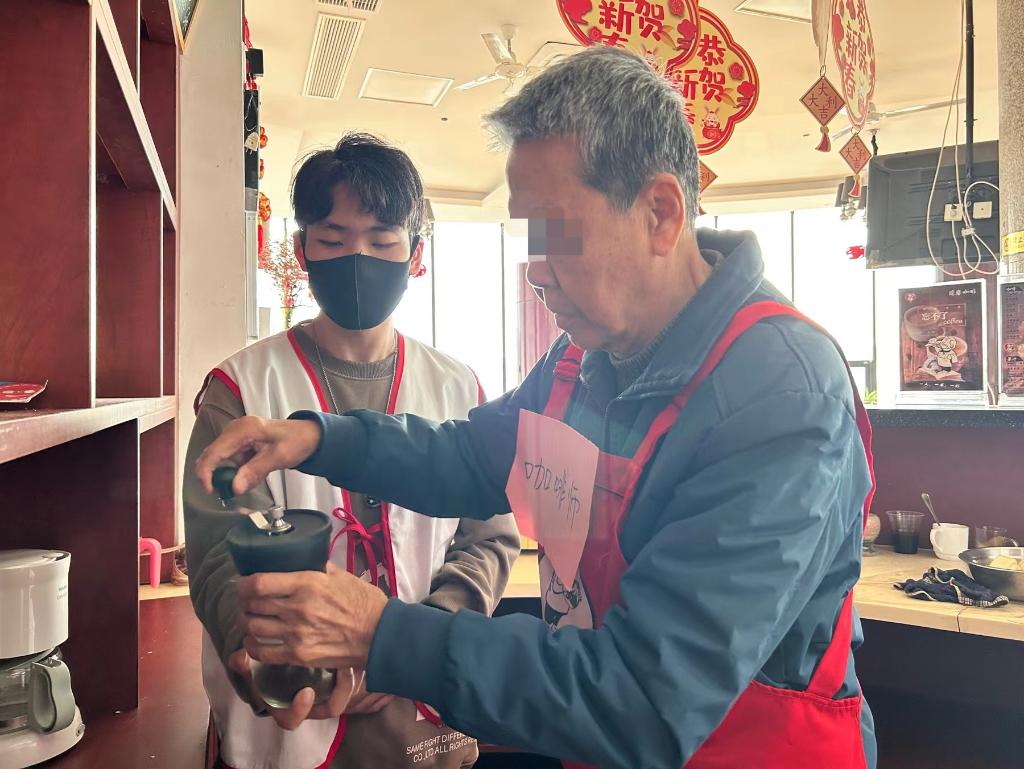 2023年3月21日,认知症老人在医务社工的协助下制作咖啡。