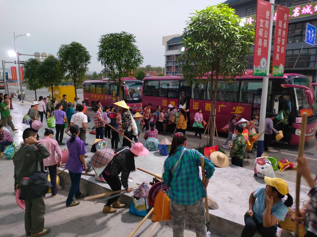 隆安县震东集中安置区是广西较大的易地搬迁集中安置区之一。脱贫户赵金会前一晚在微信群里报名到一家农场收甘蔗,第二天一早就和十多名工友一起,坐上社区安排的免费送工大巴到岗。