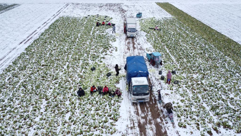 12月12日,河南扶沟县吕潭乡吉唐庄村的村民正在雪中采摘蔬菜。(扶沟县委宣传部供图)