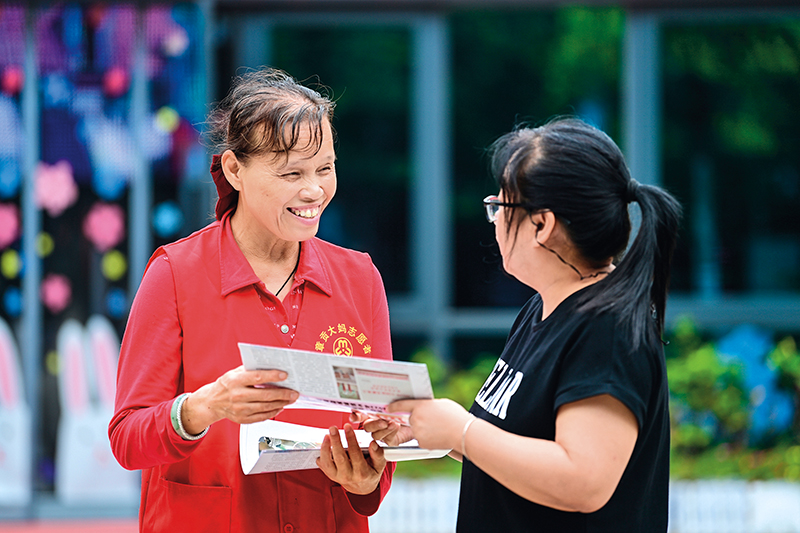 在江西省赣州市章贡区长征广场,熊晓莉(左)进行志愿服务活动(2023年9月1日摄) 胡江涛摄