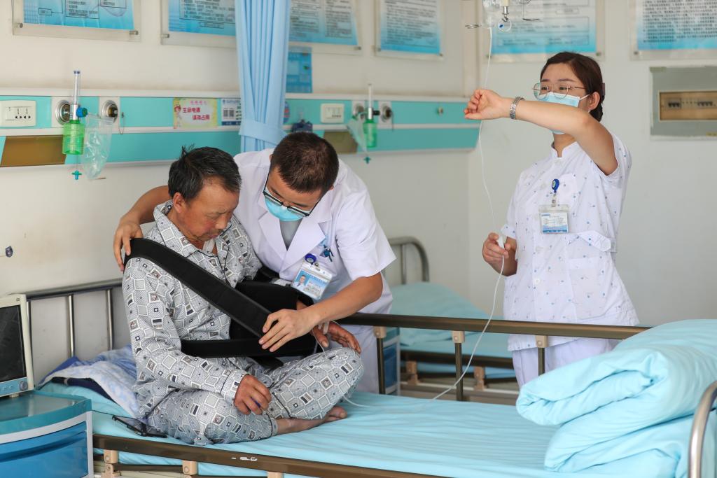 8月11日,在榆中县第一人民医院,医护人员为伤员佩戴肩关节支具并输液。