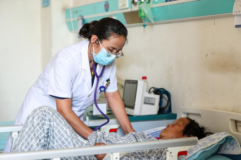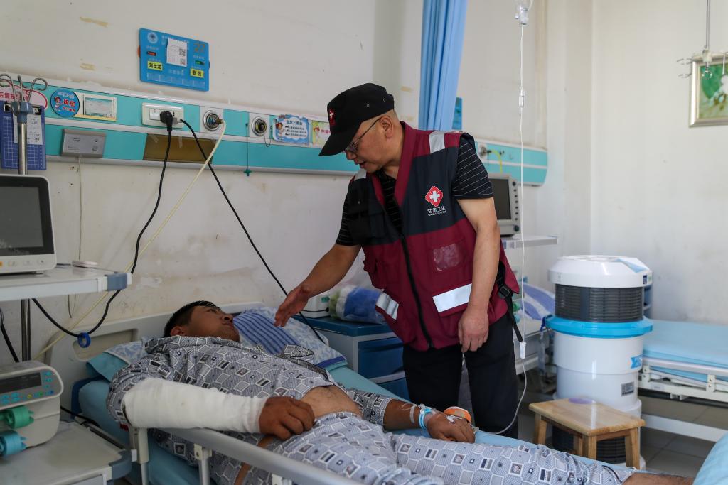 8月11日,在榆中县第一人民医院,医疗救治组专家、甘肃省第二人民医院急诊科副主任韩浩为伤员诊疗。