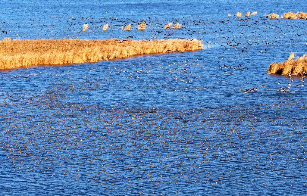 湖面上,灰褐色的野鸭悠然游弋,泛起涟漪;浅滩上,白鹭、苍鹭翩然起舞。一群大雁骤然起飞,带动上千只鸭类振翅升空,翅膀拍击空气的声响在湖面回荡。水波与鸟影交相辉映,构成一幅震撼人心的自然画卷。