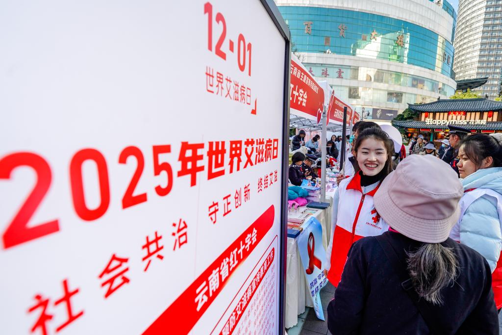 12月1日,工作人员在昆明市南屏广场举办的2025年世界艾滋病日云南省主题宣传月启动仪式上为市民普及防艾知识。