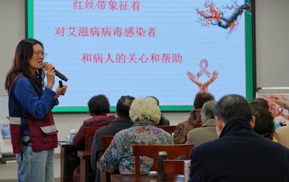 12月1日,江苏省海安市疾控中心高新区分中心工作人员为海安老年大学高新区分校老年学员介绍红丝带的意义。