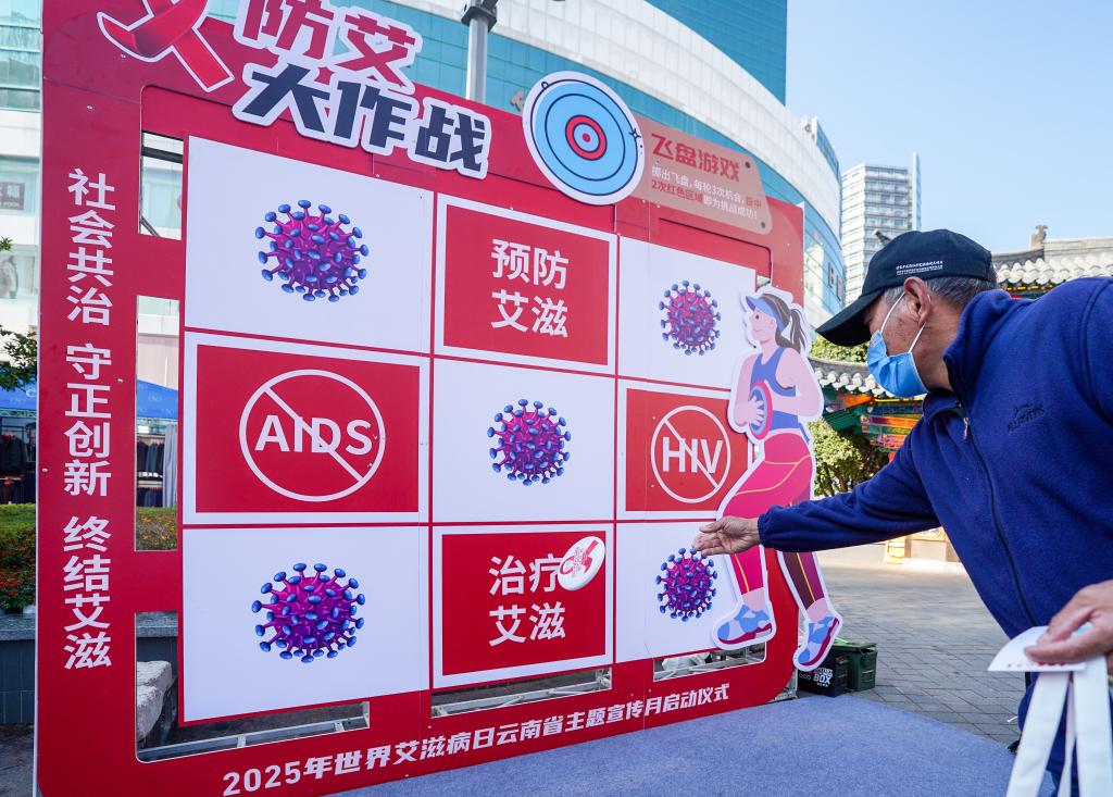 12月1日,市民在昆明市南屏广场举办的2025年世界艾滋病日云南省主题宣传月启动仪式上参与防艾宣传小游戏。