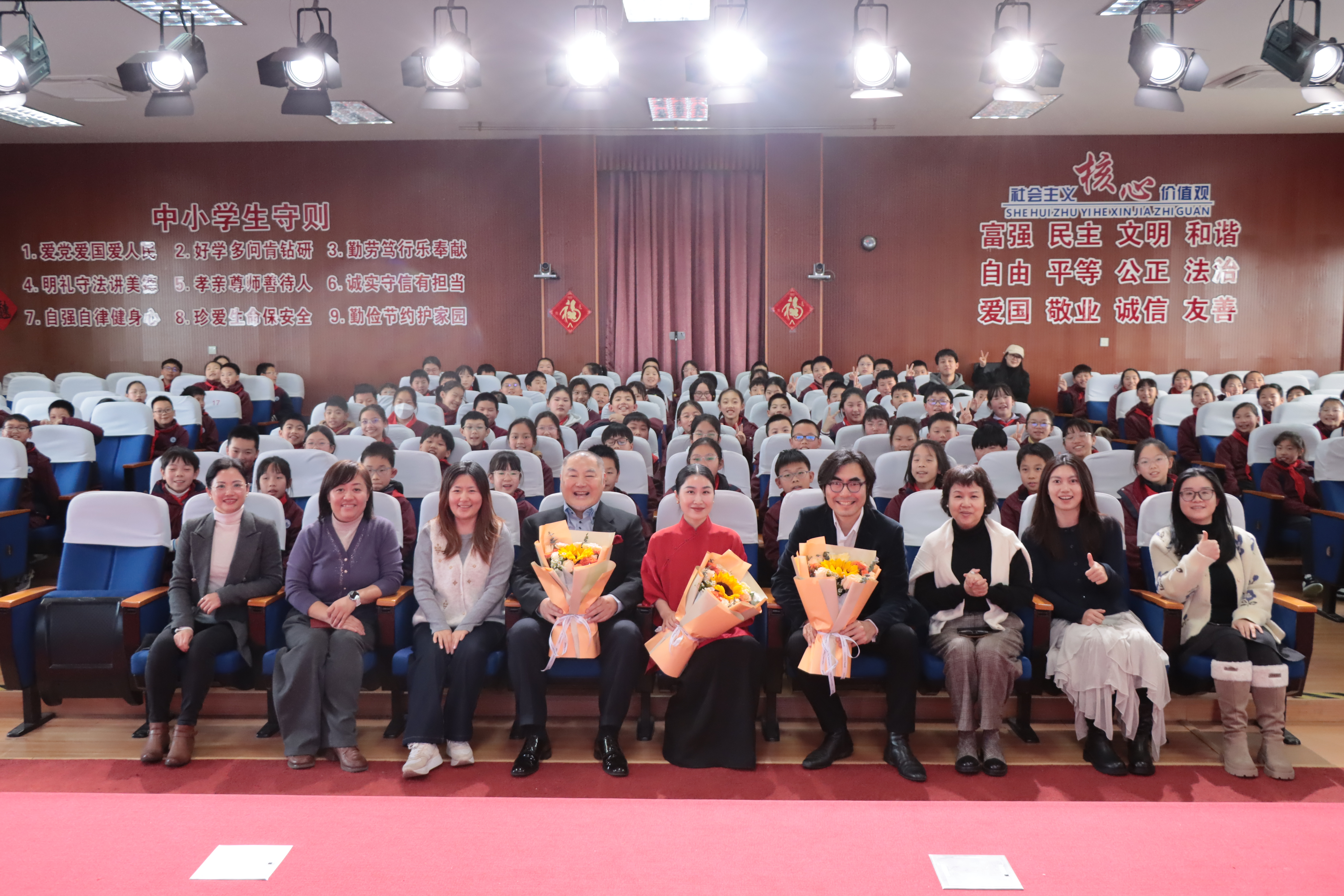 图为演出嘉宾与学校师生合影。