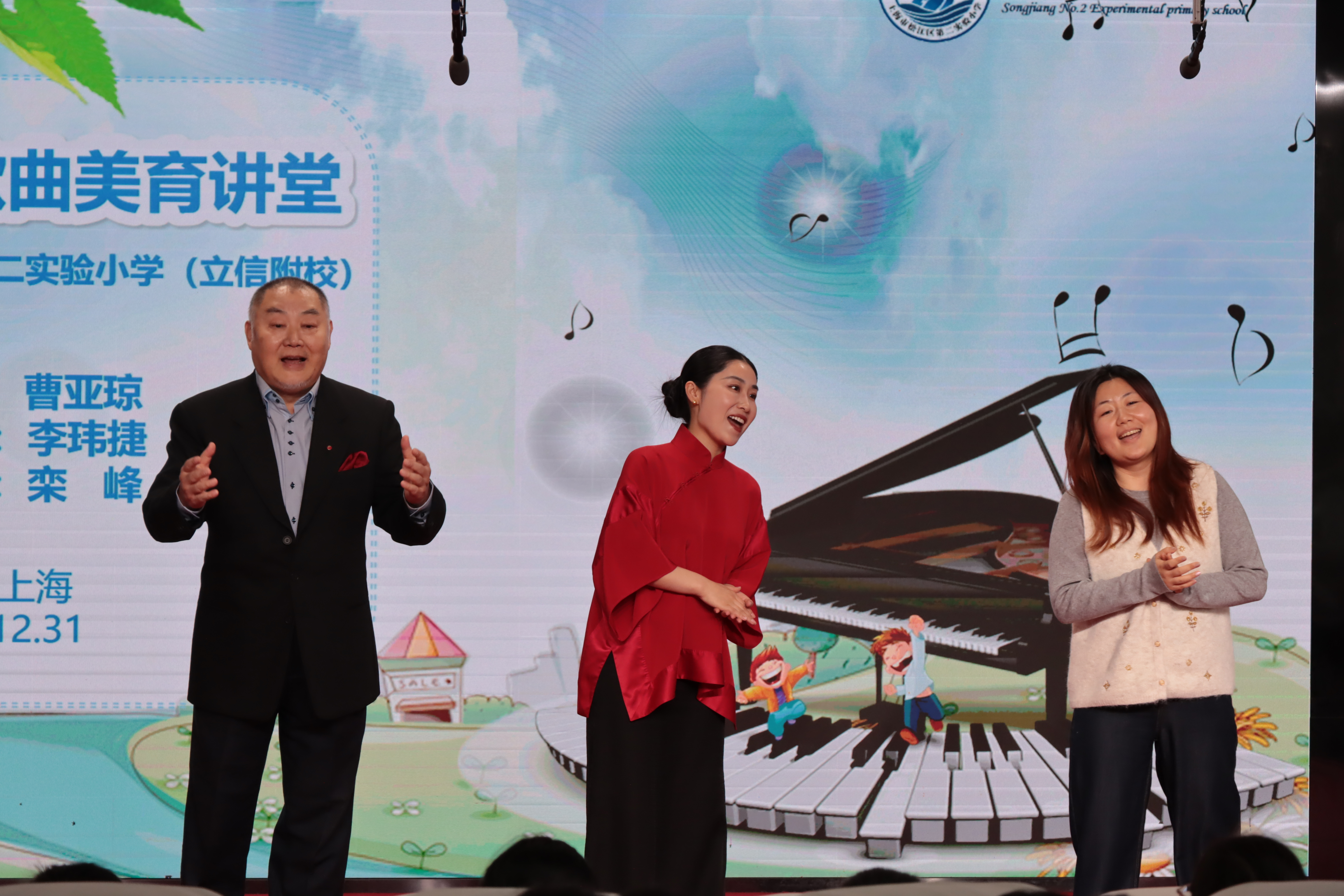 图为旅意男低音歌唱家栾峰(左一)、女高音歌唱家曹亚琼(中)与松江区第二实验小学的音乐老师(右一)共同演唱。