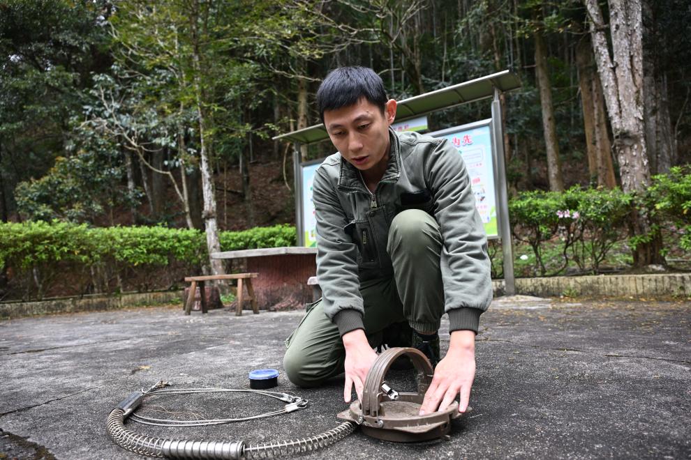 3月17日,广东省乳阳林场八宝山管护站负责人周智鹏介绍在巡山途中发现的捕兽夹。