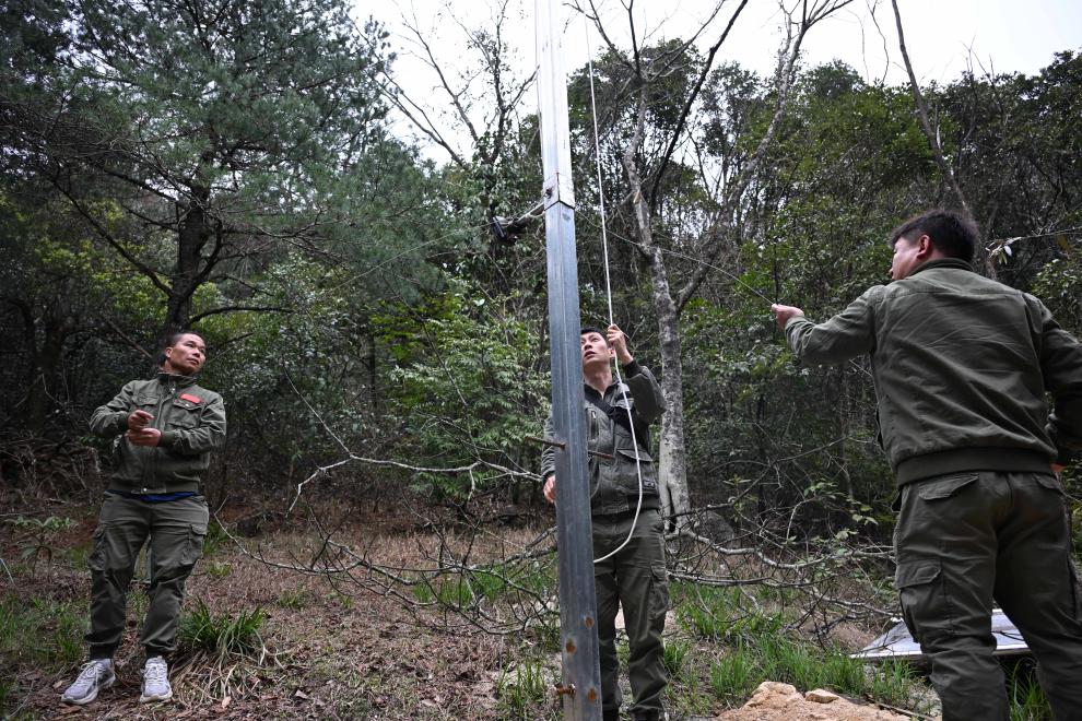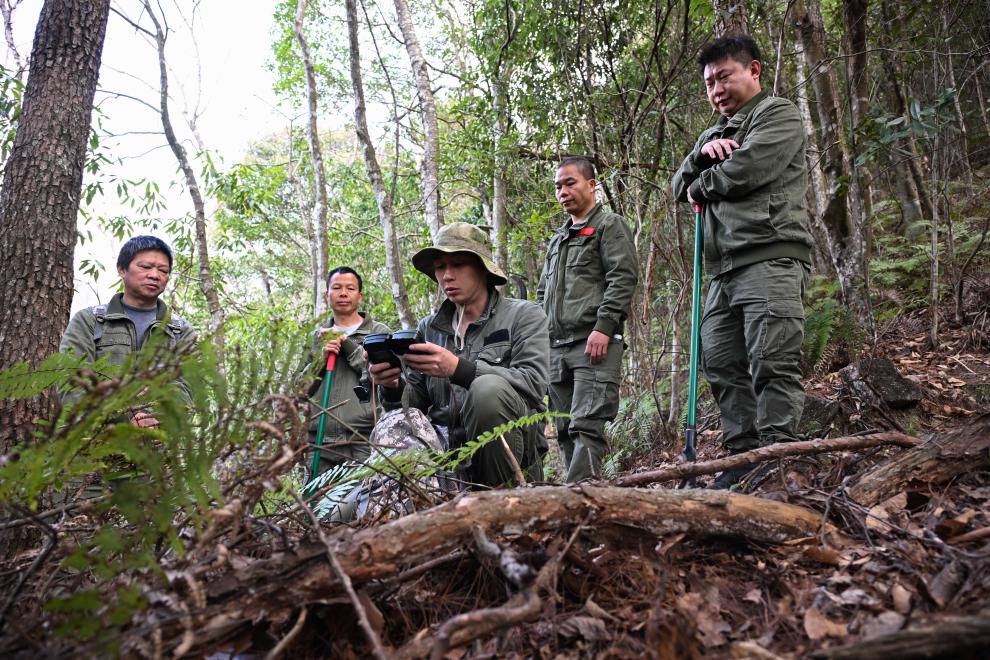 3月17日,广东省乳阳林场八宝山管护站负责人周智鹏(中)与同事周水金(右)、张小平在小黄山便道查看森林监测设备。