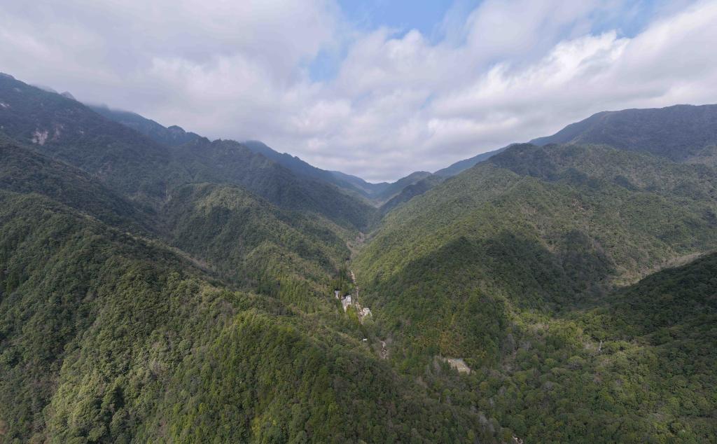 坐落于南岭山脉中的广东省乳阳林场八宝山管护站(3月17日摄,无人机照片)。