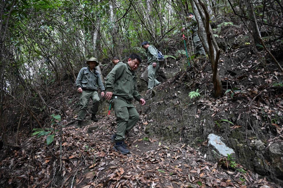 3月17日,广东省乳阳林场八宝山管护站护林员在鸡公坑便道巡山途中,周智鹏(中)在准备红外相机。