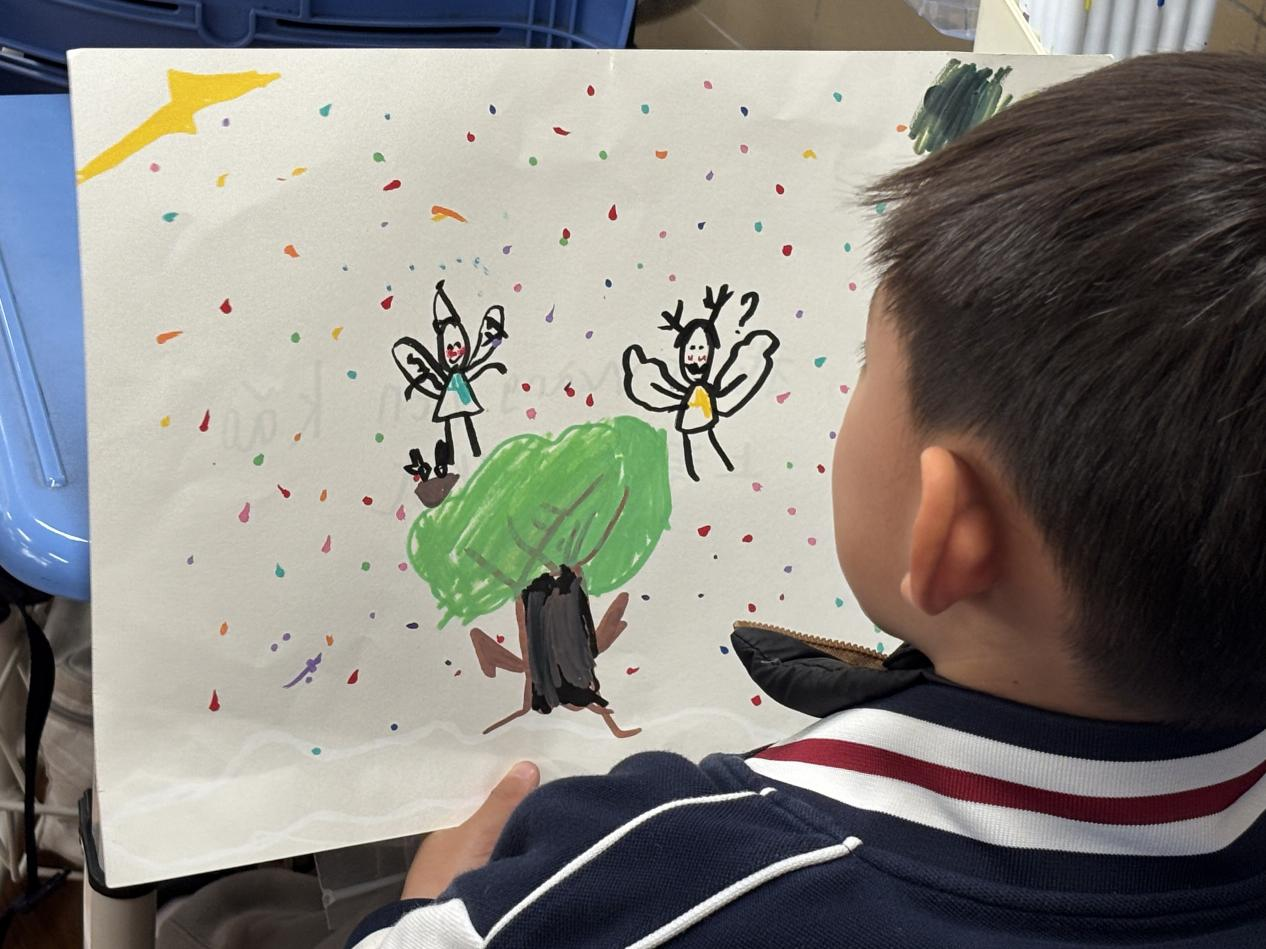 彩笔落在纸上的沙沙声,从上海外国语大学松江外国语学校一年级的教室里轻轻传出。四十五个孩子埋着头,神情专注。讲台上没有教案,没有范画,只有一个温和的声音在问:“如果把自己的情绪变成一个小精灵,它会是什么样子?”