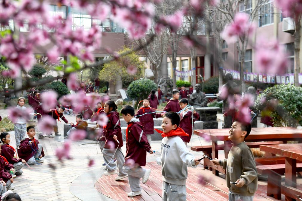 3月26日,在日照市莒县第一实验小学,同学们在进行阳光大课间活动。