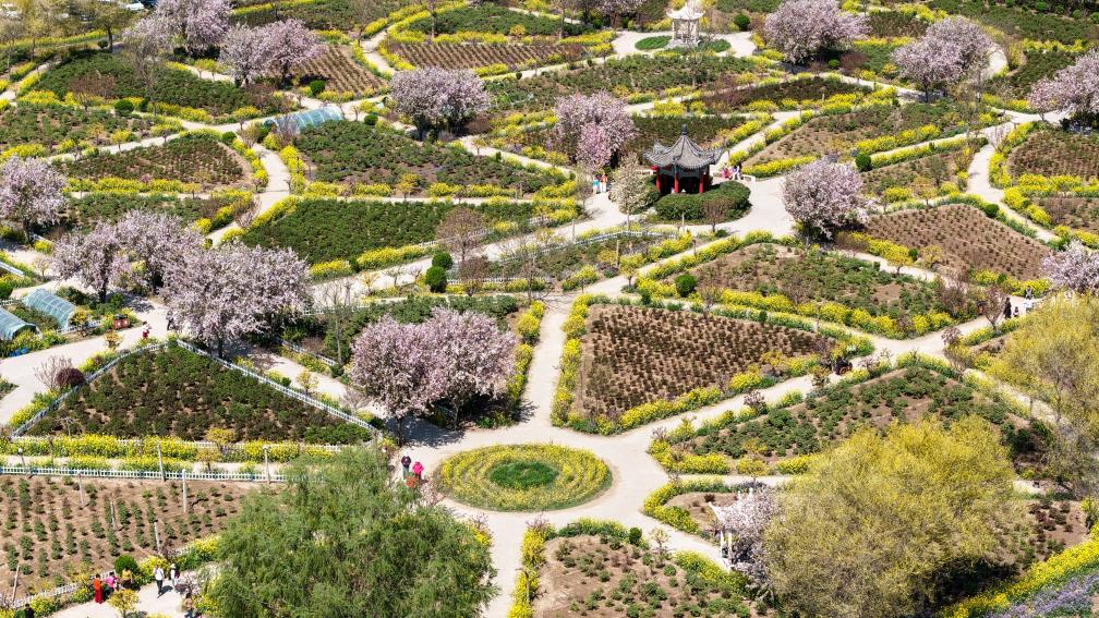 4月6日,游客在河北省晋州市周家庄乡农旅观光园赏花游玩(无人机照片)。