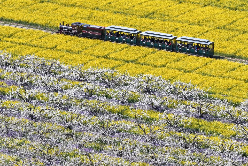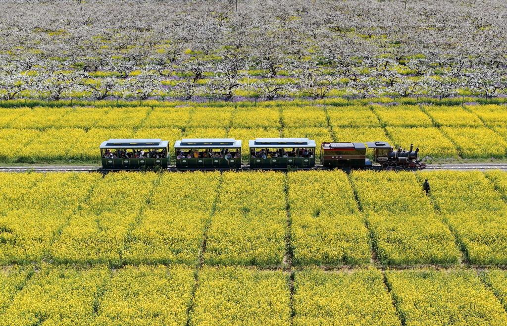 4月6日,游客乘观光小火车从河北省晋州市周家庄乡第九生产队梨园旁经过(无人机照片)。
