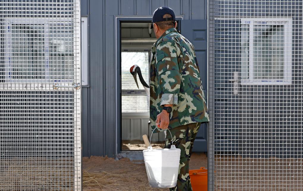 4月9日,在宁夏青铜峡库区湿地自然保护区丹顶鹤标准化适应性训练场,工作人员为丹顶鹤准备食物。