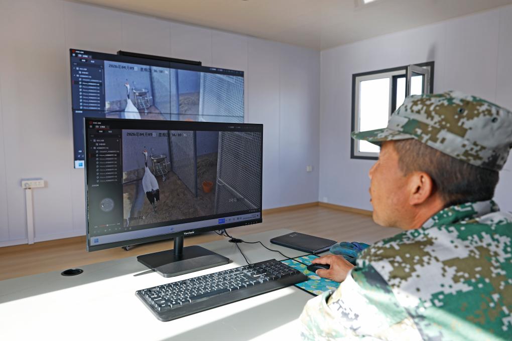 4月9日,在宁夏青铜峡库区湿地自然保护区丹顶鹤标准化适应性训练场,工作人员通过监控查看丹顶鹤的进食状况。